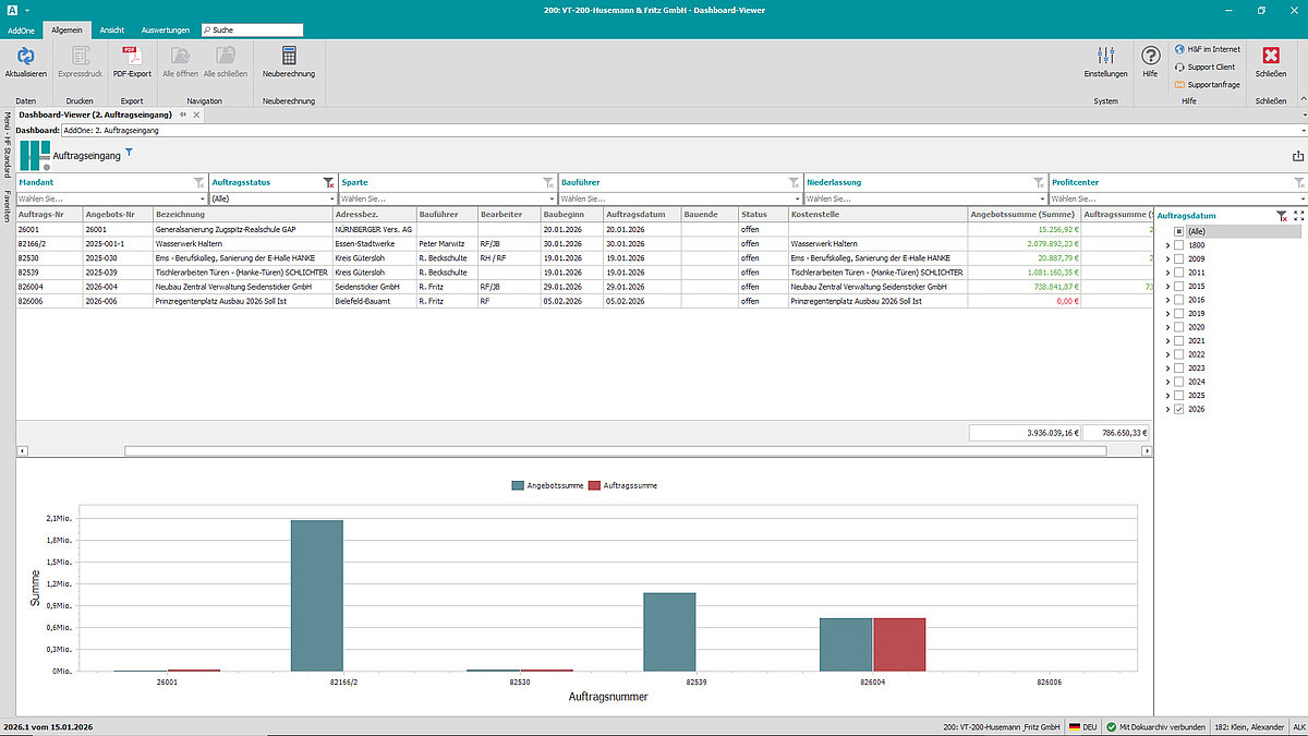 Überblick über laufende Angebote und Aufträge mit tabellarischer Darstellung und grafischer Auswertung.