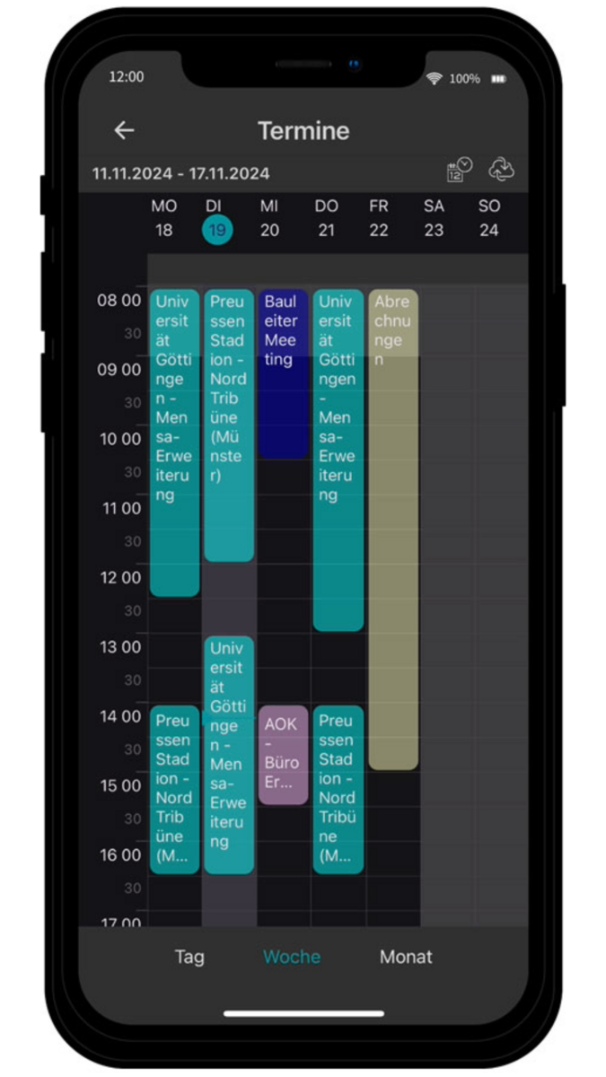 Kalenderansicht mit sämtlichen Baustellen, Terminen und Projektmeetings – übersichtlich dargestellt für eine strukturierte Tagesplanung.